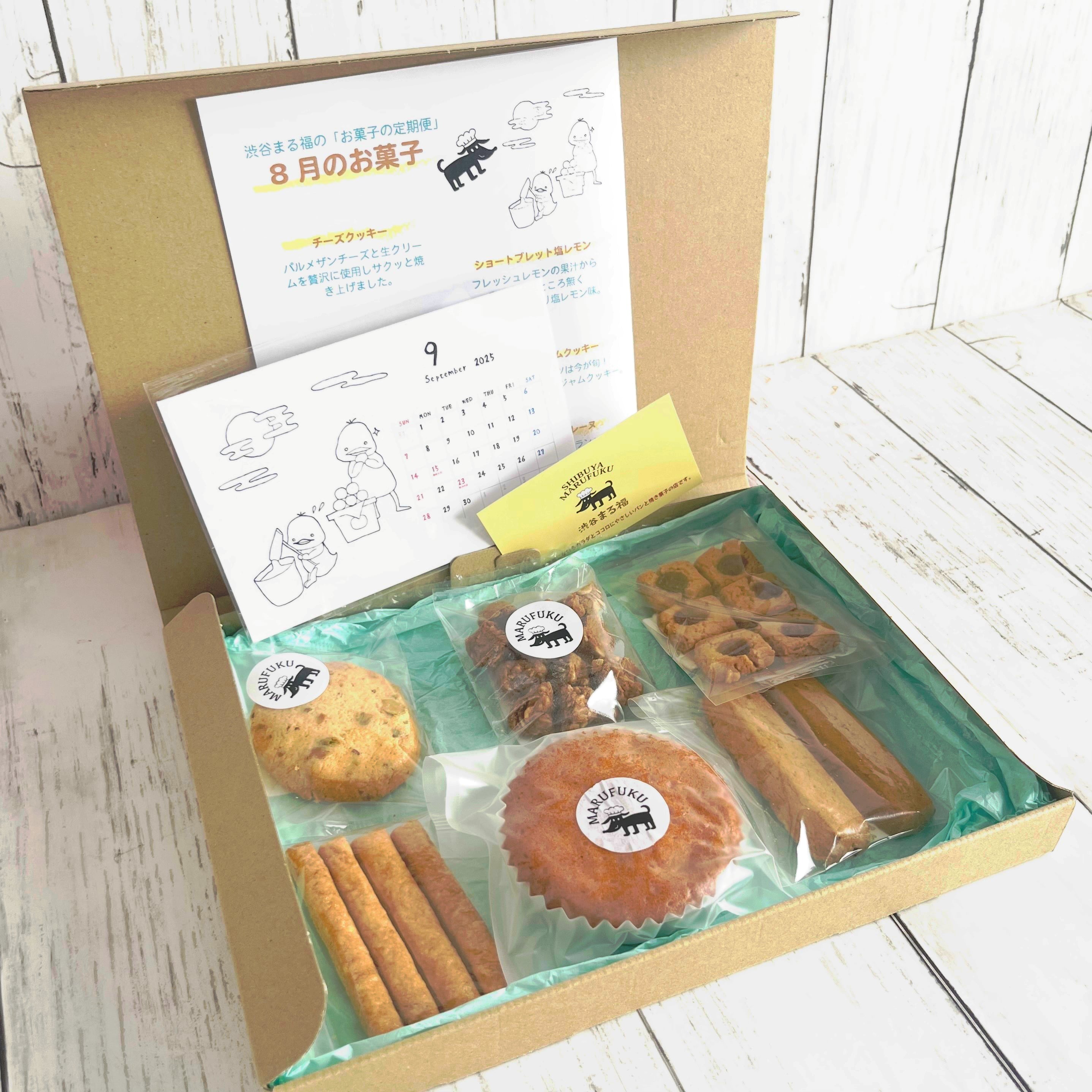 渋谷まる福のオススメの焼き菓子を6品程度セレクトして、毎月お届けします。